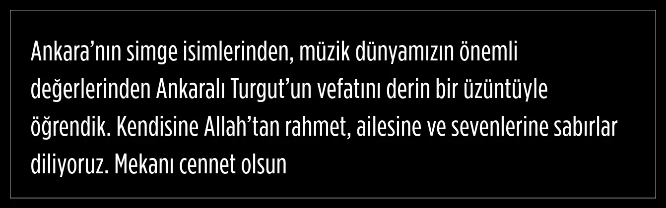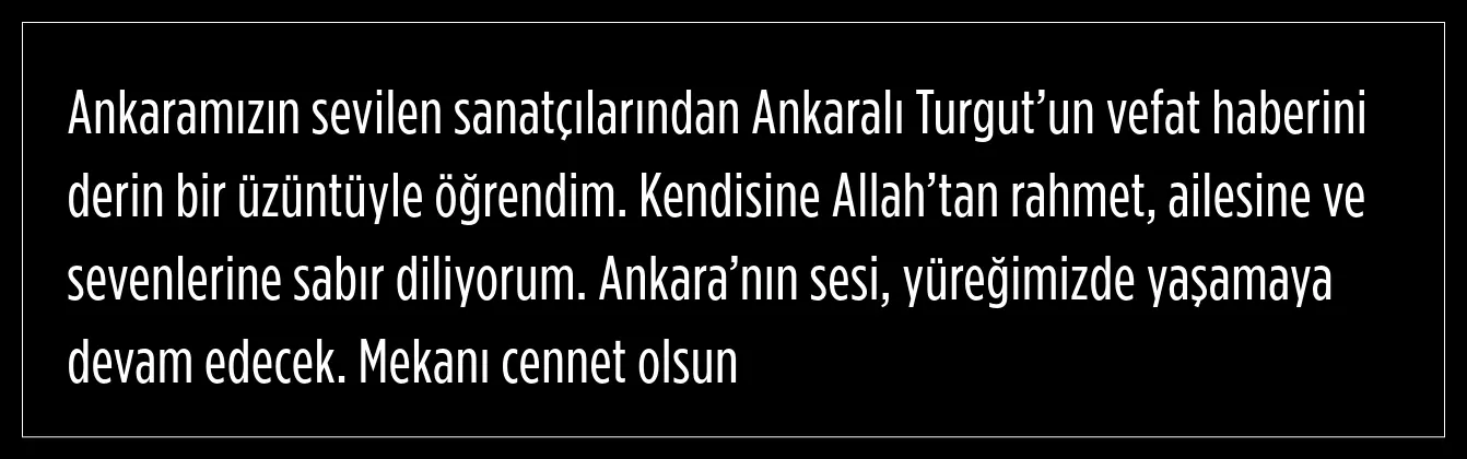 Ankaralı Turgut, hayatını kaybetti. Ankara Büyükşehir Belediye Başkanı Mansur Yavaş, sosyal medya hesabından başsağlığı mesajı paylaştı.
