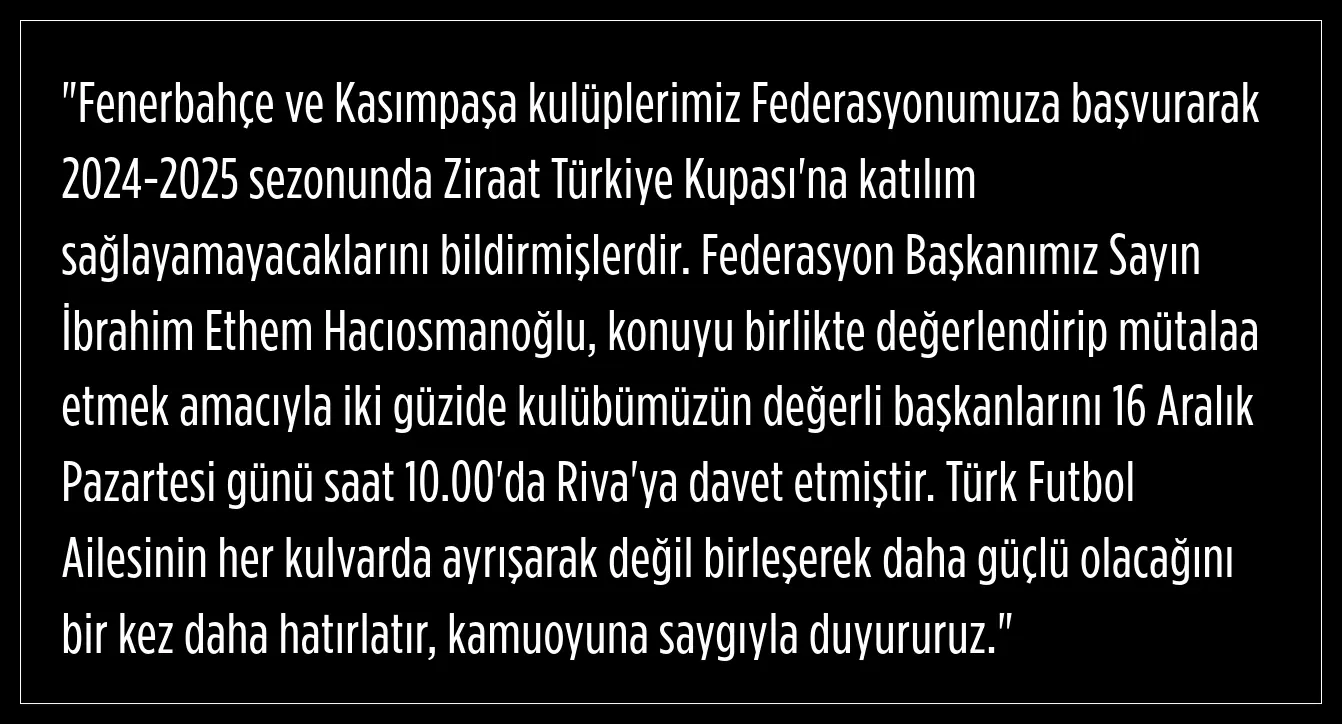 Türkiye Futbol Federasyonu (TFF), bu sezon Ziraat Türkiye Kupası’na katılmama kararı alan Fenerbahçe ve Kasımpaşa kulüplerinin başkanlarını kritik bir toplantı için davet etti.