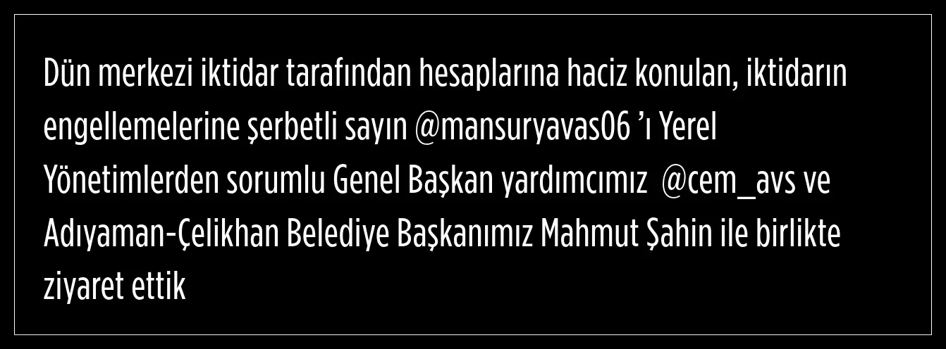 Demokrasi ve Atılım Partisi (DEVA) Genel Başkan Yardımcısı İdris Şahin, Ankara Milletvekili İdris Şahin, Yerel Yönetimlerden sorumlu Genel Başkan yardımcısı Cem Avşar ve Adıyaman-Çelikhan Belediye Başkanı Mahmut Şahin, Mansur Yavaş'ı ziyaret etti.
