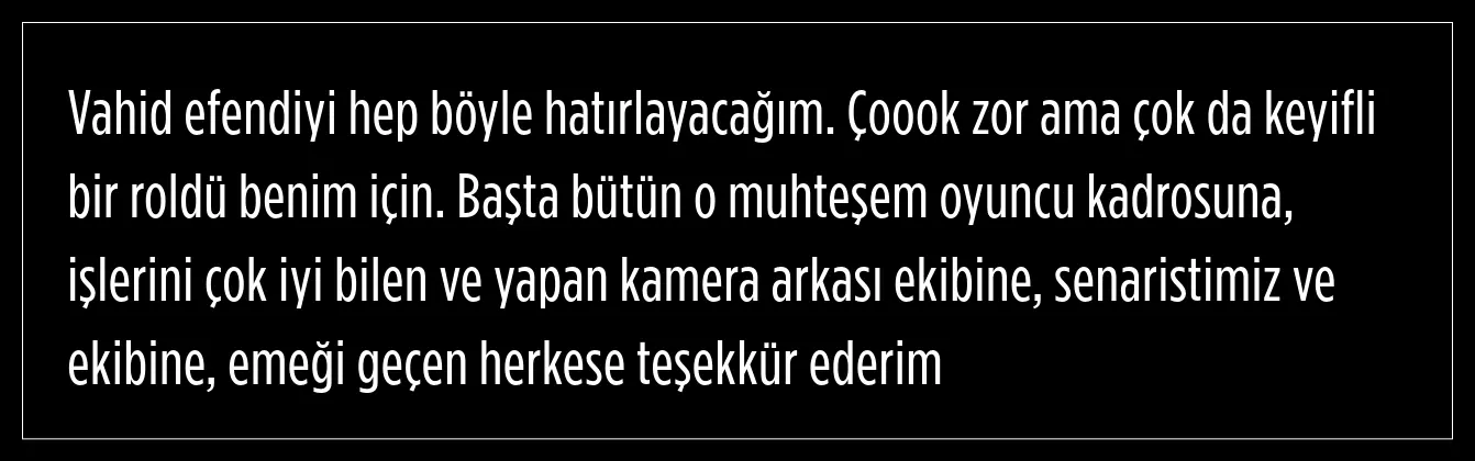 Tekin, Instagram üzerindeki paylaşımında Vahid rolünün kendisi için zor ama keyifli bir rol olduğunu ifade etti.
