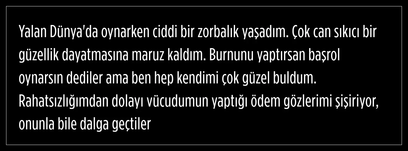 "Yalan Dünya'nın yayınlandığı dönemde çok popülerdim" diyen ünlü isim, kadın oyunculara yönelik estetik ve güzellik baskısına maruz kaldığını belirtti.