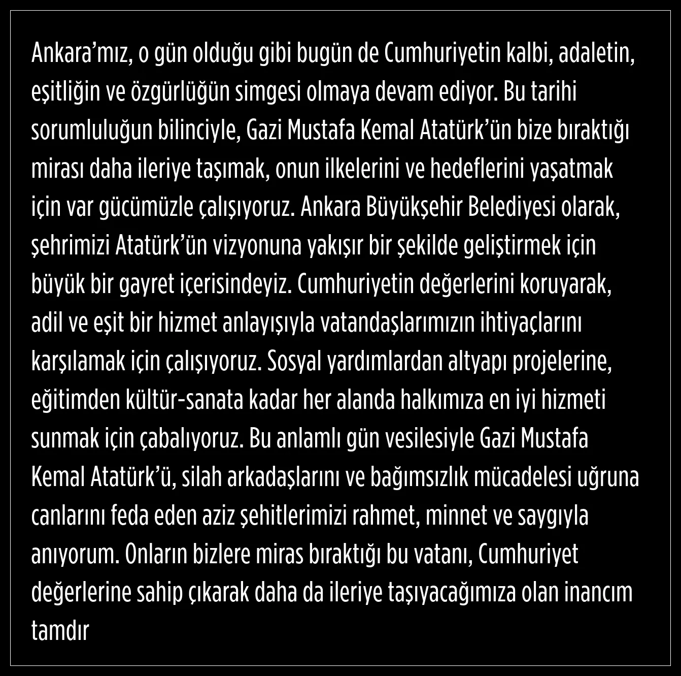 "Ankara’mız, o gün olduğu gibi bugün de Cumhuriyetin kalbi, adaletin, eşitliğin ve özgürlüğün simgesi olmaya devam ediyor" diyen ABB Başkanı, Atatürk’ün bıraktığı mirası daha ileriye taşımak, onun ilkelerini ve hedeflerini yaşatmak için var güçleriyle çalıştıklarını belirtti.
