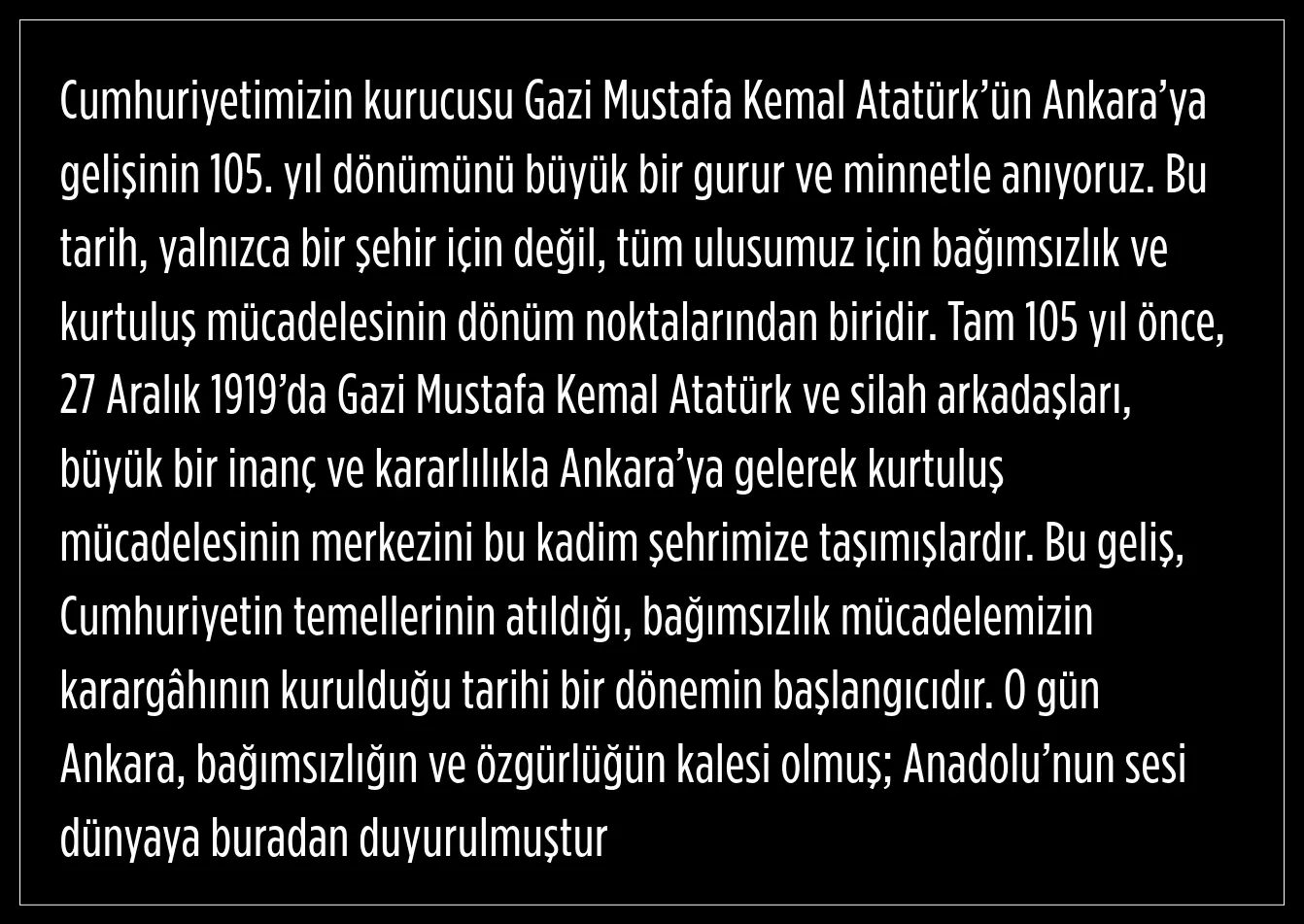 Ankara Büyükşehir Belediye Başkanı Mansur Yavaş, Mustafa Kemal Atatürk'ün Ankara'ya gelişinin 105. yıl dönümü kapsamında bir mesaj yayımladı.