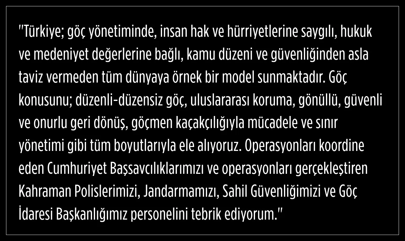 Cumhuriyet Başsavcılıkları ile Göç İdaresi Başkanlığımızın koordinasyonunda; Emniyet Genel Müdürlüğü, Jandarma Genel Komutanlığı ve Sahil Güvenlik Komutanlığınca düzensiz göç ve göçmen kaçakçılarıyla yapılan mücadele çalışmaları kapsamında metruk yerler, umuma açık eğlence mekânları, tır garajları, terminaller, limanlar, toplu taşıma durak ve istasyonlarında; 402 bin 609 kişinin kimlik kontrolünün yapıldığı denetimlerde; 26 bin 456 personel, 8 bin 370 ekip ile 5 bin 446 noktada; 4 bin 295 metruk bina, 7 bin 776 umuma açık yer, 514 terminal ve 3 bin 31 diğer yerler olmak üzere toplam 15 bin 616 yer kontrol edildi. Tespit edilen düzensiz göçmenlerin ülkelerine geri gönderilme işlemleri başlatıldı.
