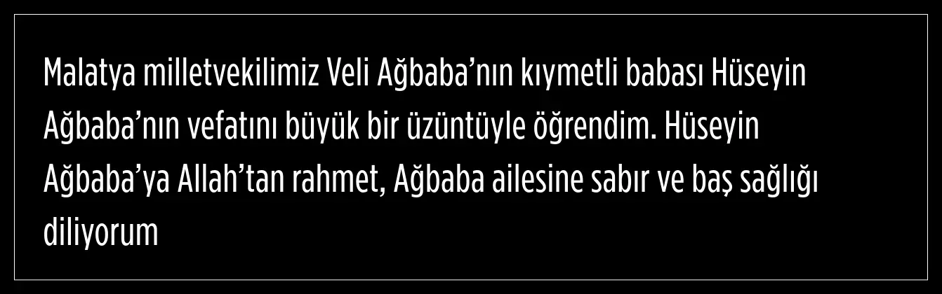 Cumhuriyet Halk Partisi Malatya Milletvekili Veli Ağbaba, babası Hüseyin Ağbaba'nın vefat haberiyle sarsıldı. Baba Ağbaba, 88 yaşındaydı.