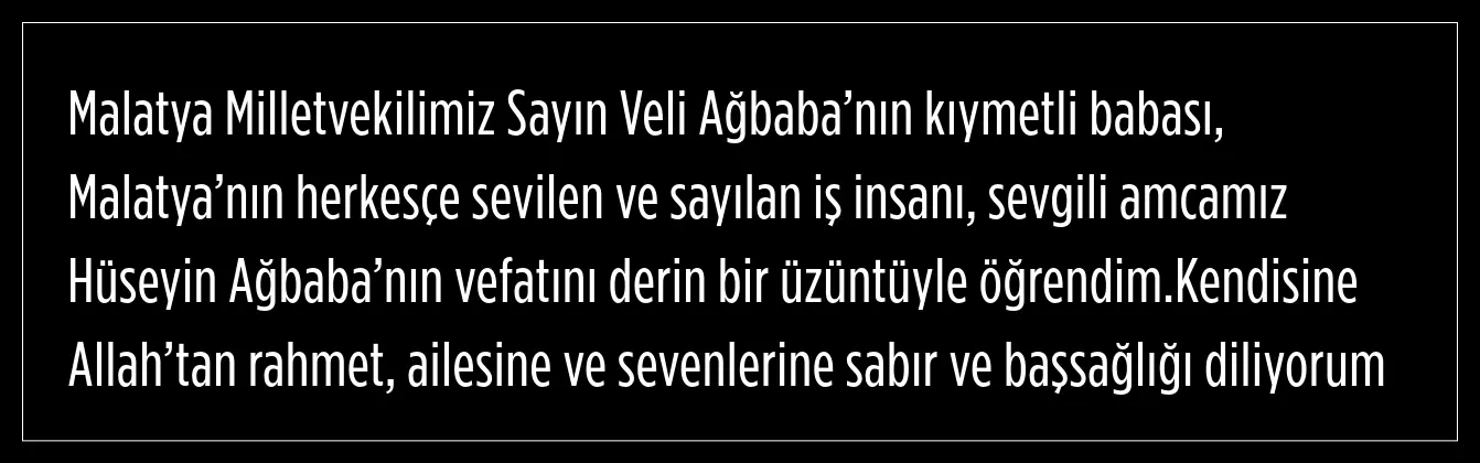 Hüseyin Ağbaba’nın cenazesi, yarın Malatya’da toprağa verilecek.Cenaze namazı, öğlen namazına müteakip kılınacak. Ağbaba, Malatya Şehir Mezarlığı’ndaki aile kabristanına defnedilecek.
