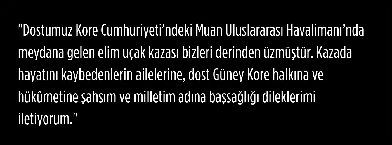Cumhurbaşkanı Recep Tayyip Erdoğan, 179 kişinin hayatını kaybettiği Güney Kore'deki uçak kazası sonrası başsağlığı mesajı yayımladı.