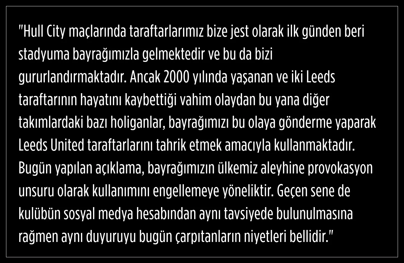 Hull City, Leeds United ile oynanacak Championship karşılaşması öncesi taraftarlarına, Türkiye bayrağı ve tişörtleri stadyuma getirmeme çağrısı yaptı.