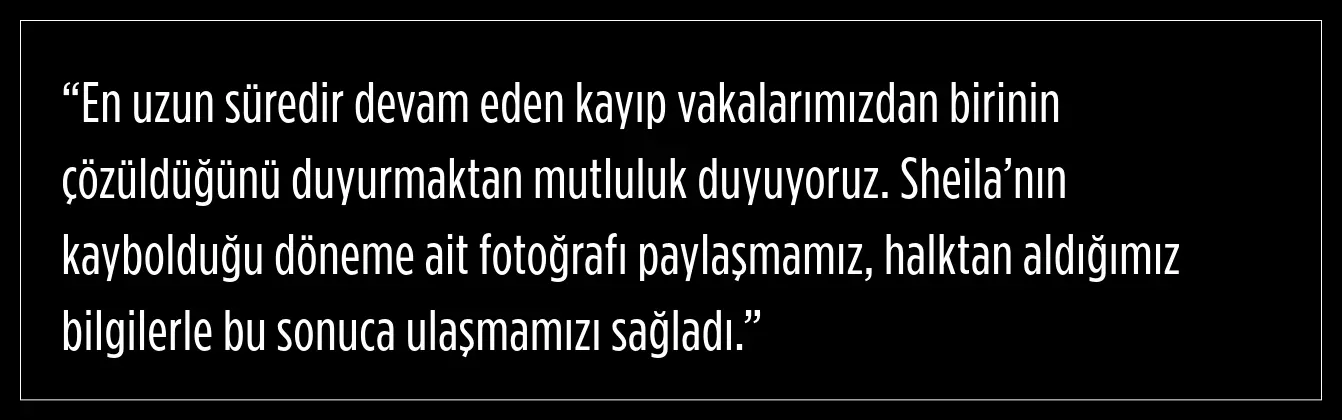 Geçtiğimiz Pazar günü, West Midlands Polisi, Sheila Fox’un kaybolduğu döneme ait bir fotoğrafı resmi web sitesi ve sosyal medya hesaplarında paylaşarak yeni bir çağrı başlattı. Bu paylaşım, birkaç saat içinde halktan yoğun bir şekilde bilgi akışı sağladı. Gelen bilgiler doğrultusunda, polis dün yaptığı açıklamada, Sheila Fox’un hayatta olduğunu ve ülkenin başka bir bölgesinde yaşadığını belirtti.