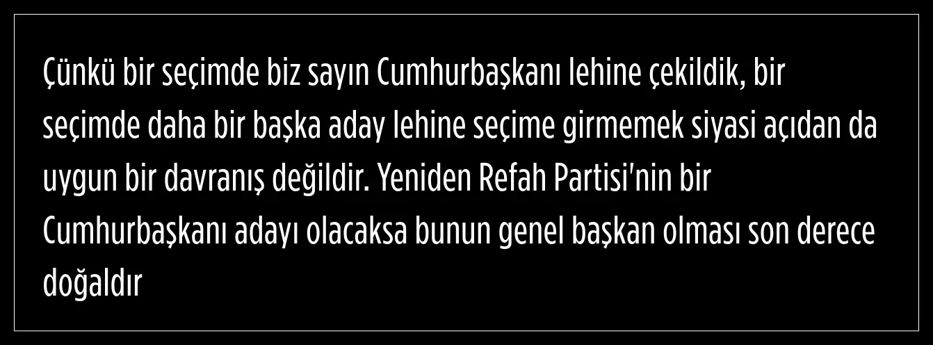Bir sonraki seçimlerde Yeniden Refah Partisi'nin cumhurbaşkanı adayını kendisinin çıkartacağını ifade eden Erbakan, şu ifadeleri kullandı: