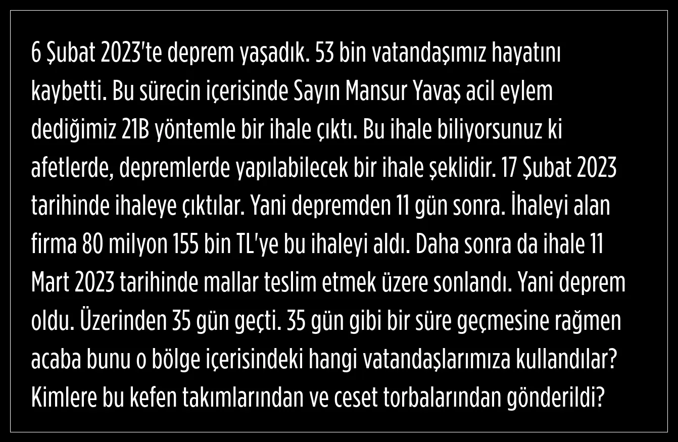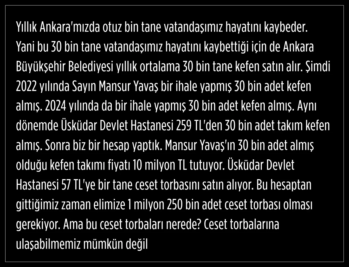 Ceset torbası ve kefen alımı ihalesinde yolsuzluk yapıldığını öne süren Osman Gökçek, Ankara Büyükşehir Belediyesinin 17 Şubat 2023 tarihinde ihaleye çıktığını söyledi.
