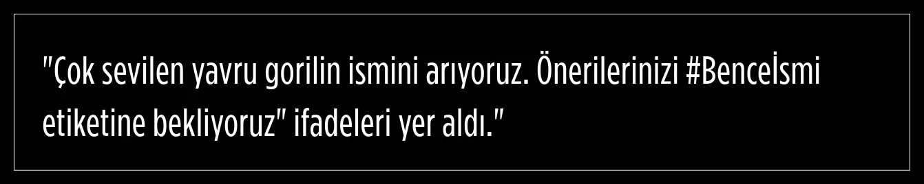 Bakanlığın duyurusunda, goril yavrusunun yeni fotoğraflarına da yer verildi. Kamuoyunda yoğun ilgi gören yavru gorilin ismi, gelen öneriler arasından seçilecek.
