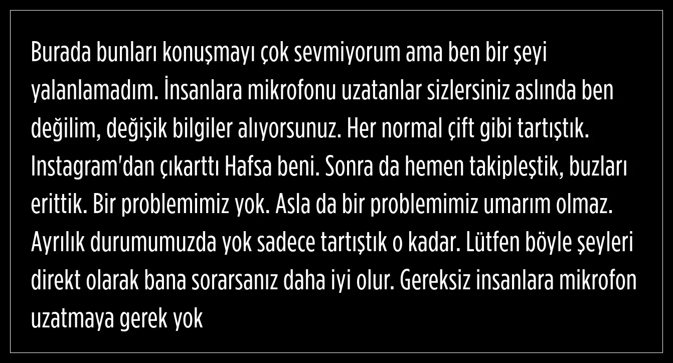 Kubilay Aka, Hafsanur Sancaktutan ile ayrılmadıklarını aralarında yalnızca bir tartışmanın olduğunu ifade etti.