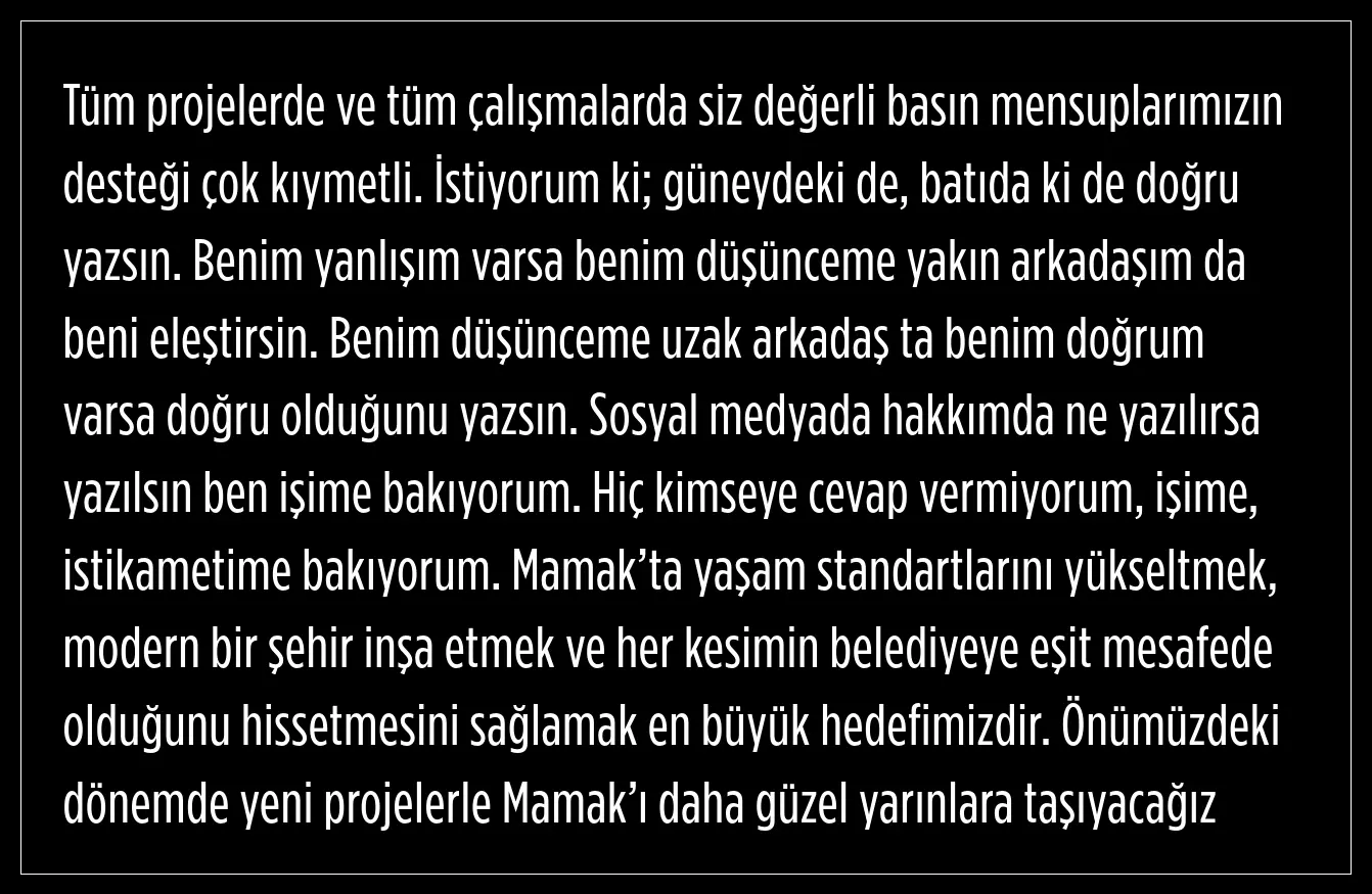 31 Mart Yerel Seçimlerinde göreve geldikleri günden itibaren sınırlı bütçeleriyle ilçeye hizmetlerini ve etkinlikleri kesintisiz sürdürdüklerini ifade eden Mamak Belediye Başkanı, önemli olanın büyük bütçeler olmadığını, doğru planlama ve mevcut kaynakların etkin kullanımı olduğunu ifade etti.