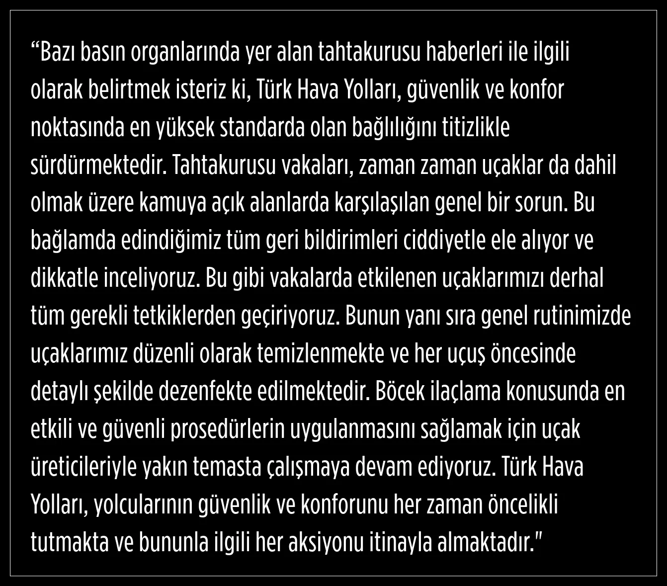 Türk Hava Yolları (THY) uçuşlarında tahtakurusu olduğu iddia edildi. Yolcular, haşerelerin koltuk ve battaniyelerde bulunduğunu öne sürdü.