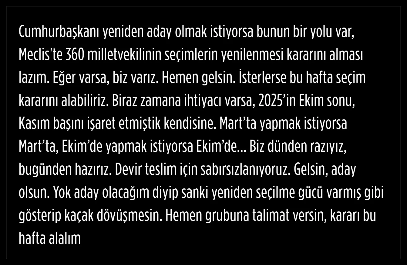 Cumhuriyet Halk Partisi Genel Başkanı Özgür Özel, erken seçim çağrısı yaptı. Özel, ''İsterlerse bu hafta seçim kararını alabiliriz, hodri meydan'' dedi.