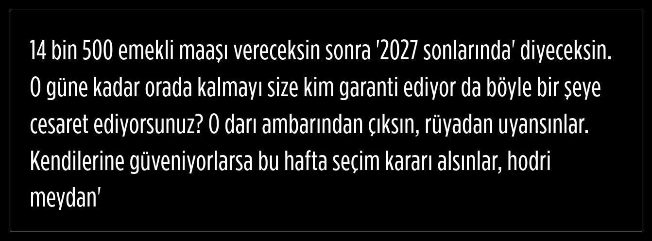 Erken seçime 2027 yılının işaret edilmesine ise CHP Lideri Özgür Özel, "O rüyada görülecek bir darı ambarı ancak aç tavuklar görür" ifadelerini kullandı.