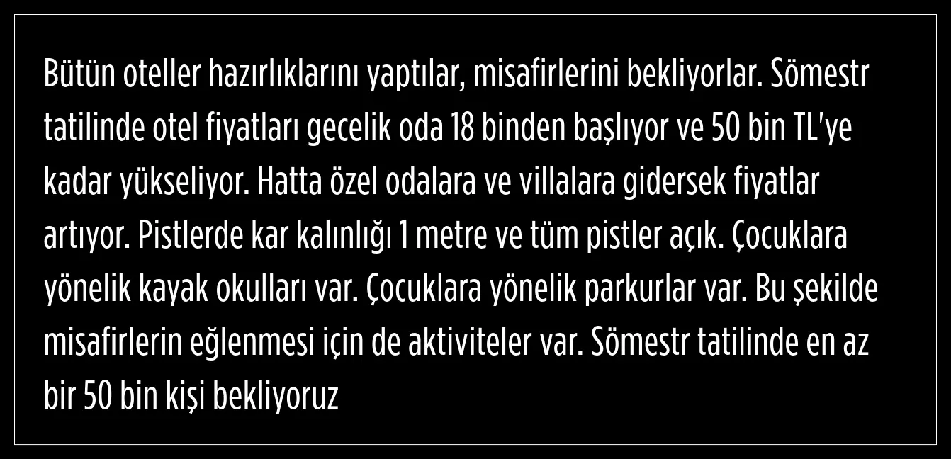 Kartalkaya’da sömestir tatili süresince otel fiyatları da dikkat çekiyor. Tatilciler, iki kişilik bir odada gecelik konaklama için 18 bin TL ile 50 bin TL arasında değişen ücretler ödeyecek. Yoğun talep nedeniyle erken rezervasyon yapanların avantajlı olduğu belirtiliyor.