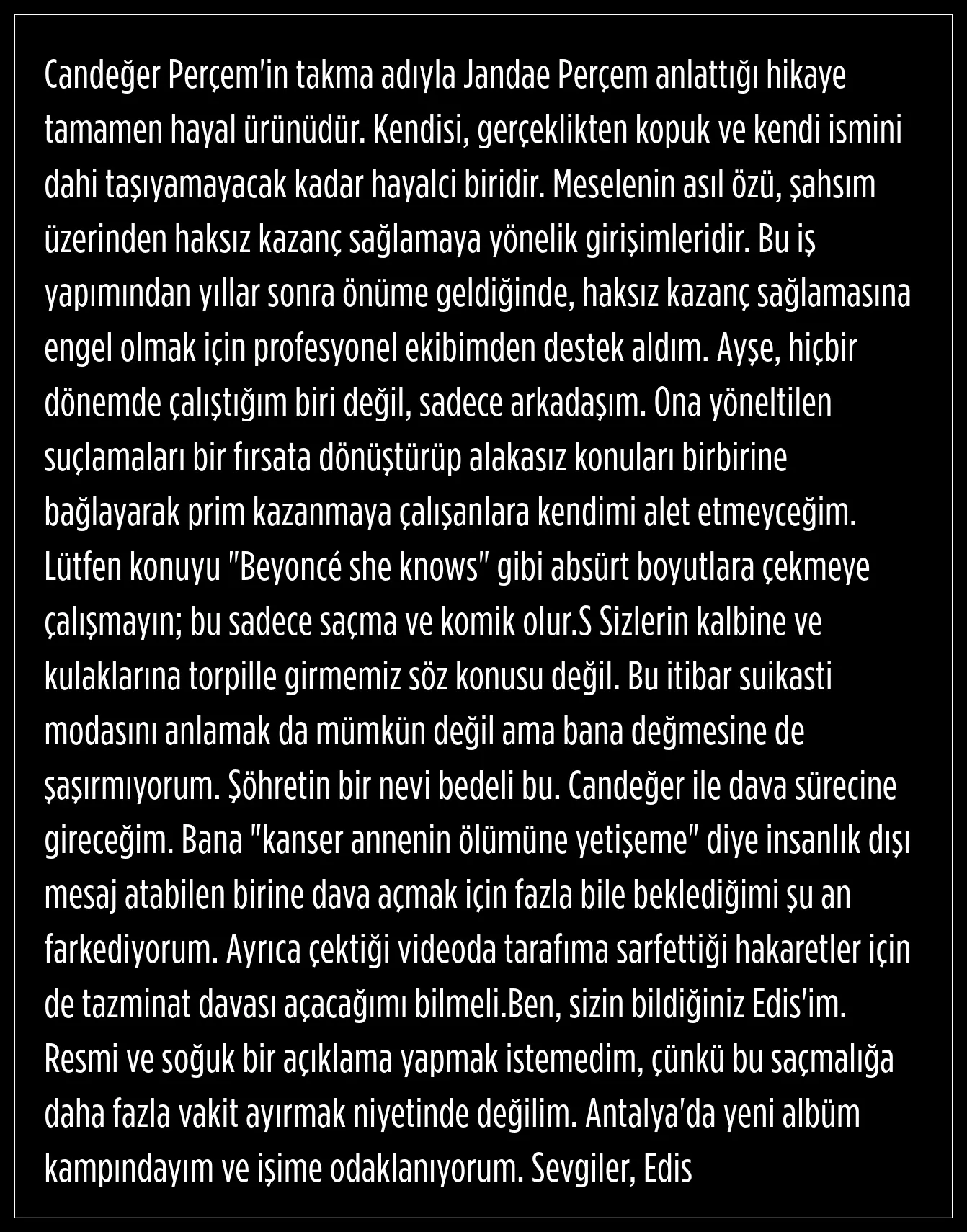 Jandae Perçem, sosyal medya hesabı üzerinden Edis ve Ayşe Barım'la ilgili iddialarda bulundu. Şarkıcı, o iddialara yaptığı paylaşımla yanıt verdi.