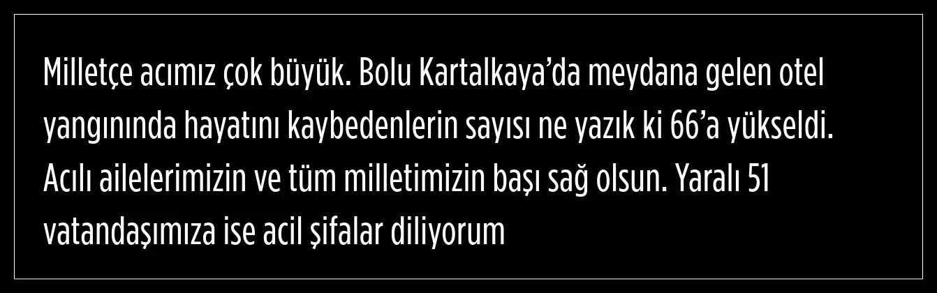 Kartalkaya'da otel yangınında can kaybı 66'ya yükseldi. Ankara Büyükşehir Belediye Başkanı Mansur Yavaş, ''Acımız çok büyük'' paylaşımı yaptı.