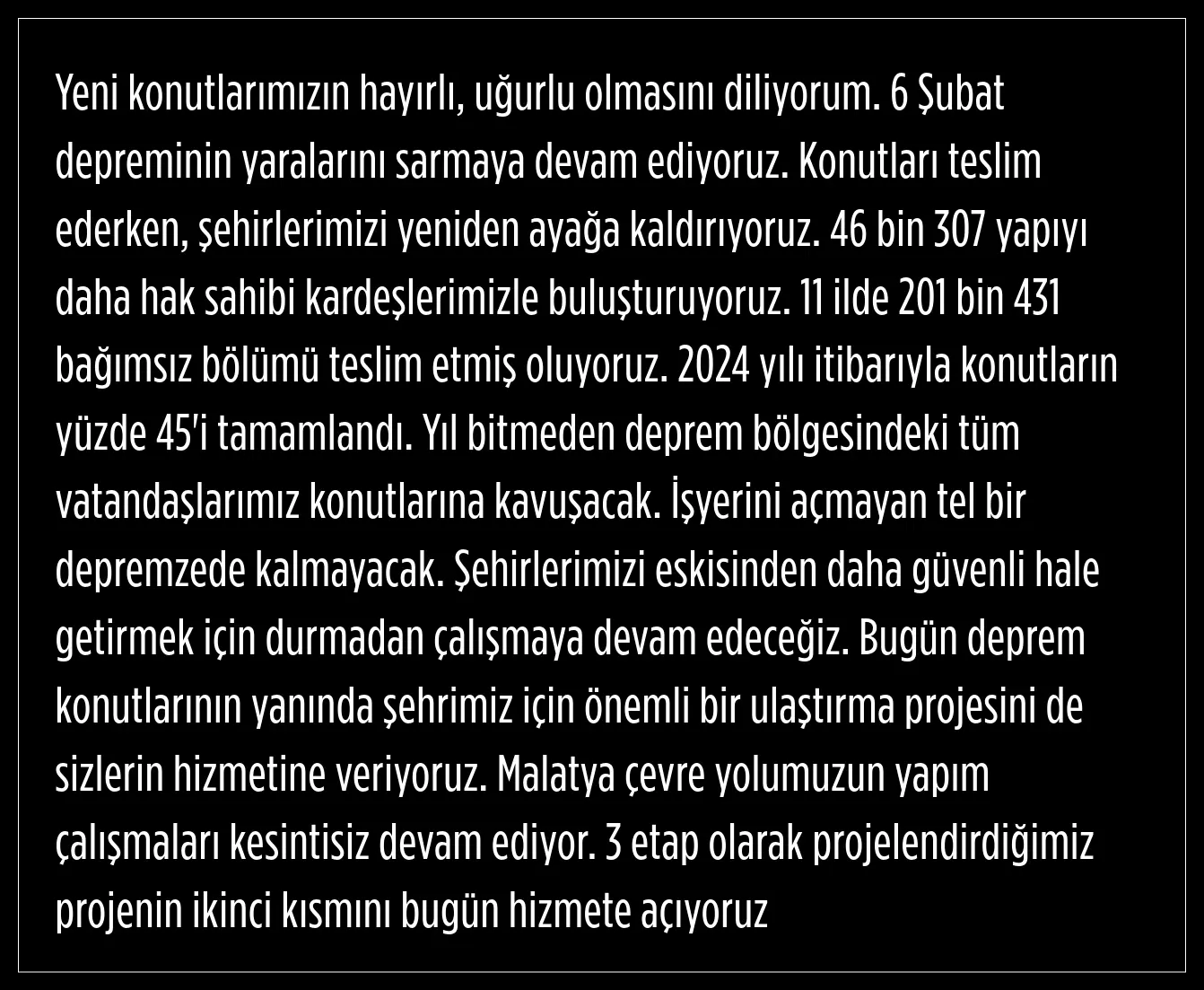 Cumhurbaşkanı, 2024 yılı itibariyle konutların yüzde 45'inin tamamlandığını ifade ederek, yıl bitmeden deprem bölgesindeki tüm vatandaşların konutlarına kavuşacağının müjdesini verdi.