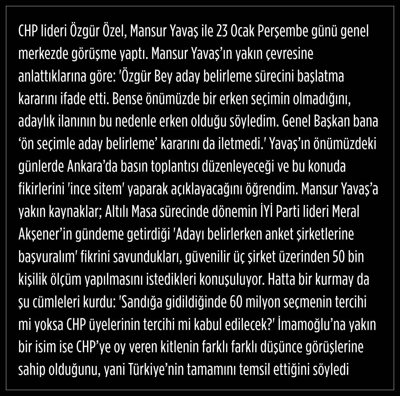 Özgür Özel, partisinin TBMM grup toplantısında adaylığa yönelik ise; şubat ve mart aylarında parti örgütü ile beraber sahada olunacağını paylaşarak, cumhurbaşkanlığı adayının belirlenmesine yönelik süreçte halkın katılımına dikkat çekti. Söz konusu sürecin CHP üyelerince şekilleneceğini dile getiren Özel, cumhurbaşkanlığı adayını belirlemek amacıyla parti üyesi olan herkesin oy kullanacağını kaydetti.