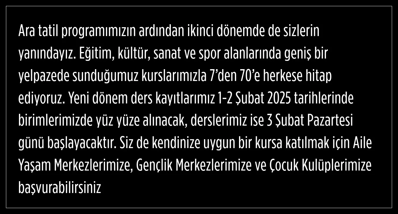 7'den 70'e herkese hitap edilen kursların yeni dönem kayıtları, 1-2 Şubat 2025 tarihleri arasında yapılacak.