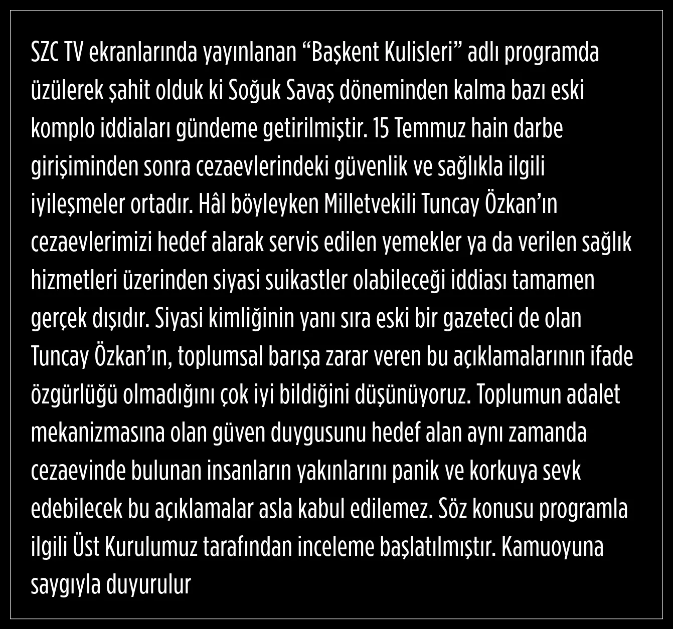 15 Temmuz hain darbe girişimden ardından cezaevlerinde güvenlik ve sağlıkla ilgili iyileştirmeler yapıldığını hatırlatan RTÜK Başkanı, Tuncay Özkan’ın cezaevleri hedef alarak servis edilen yemekler ya da verilen sağlık hizmetleri üzerinden siyasi suikastler olabileceği iddiasının tamamen gerçek dışı olduğunu vurguladı.