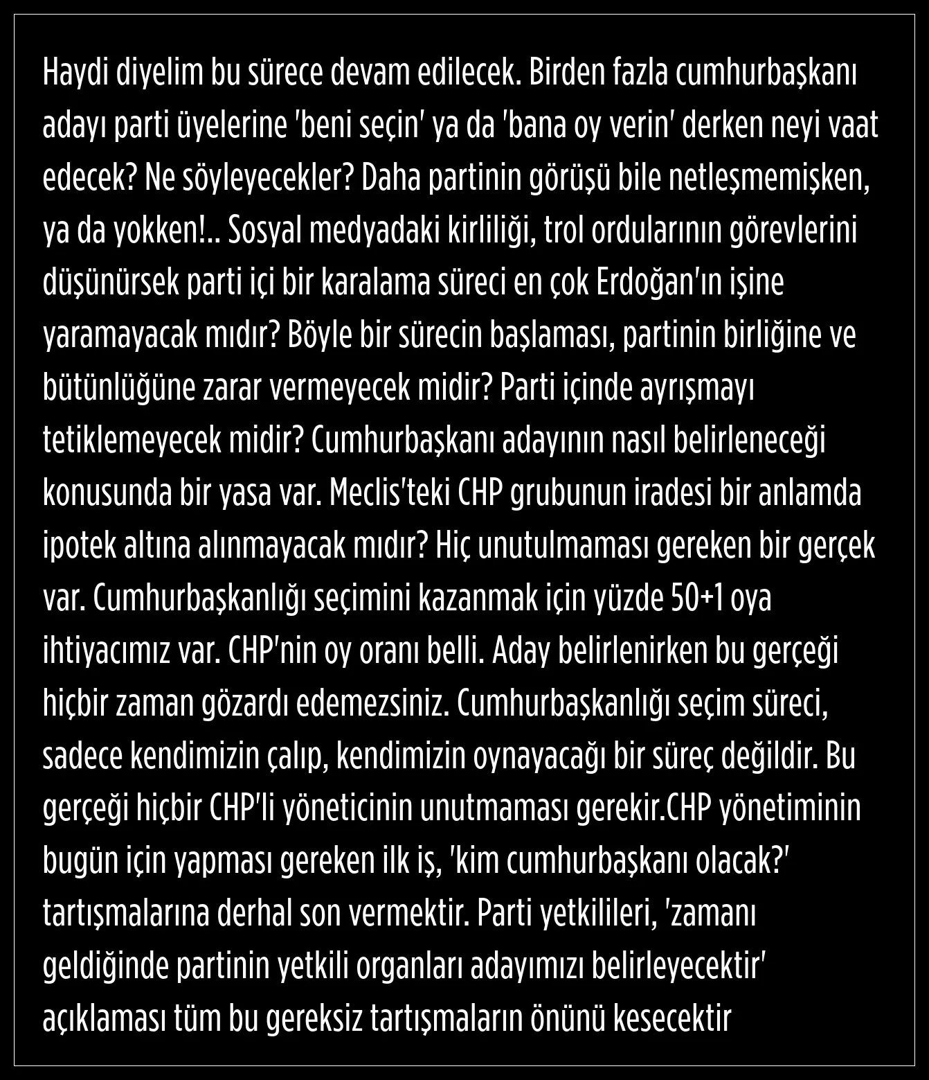 Cumhuriyet Halk Partisi'nde (CHP) cumhurbaşkanı adaylığı tartışmaları erken başladı.