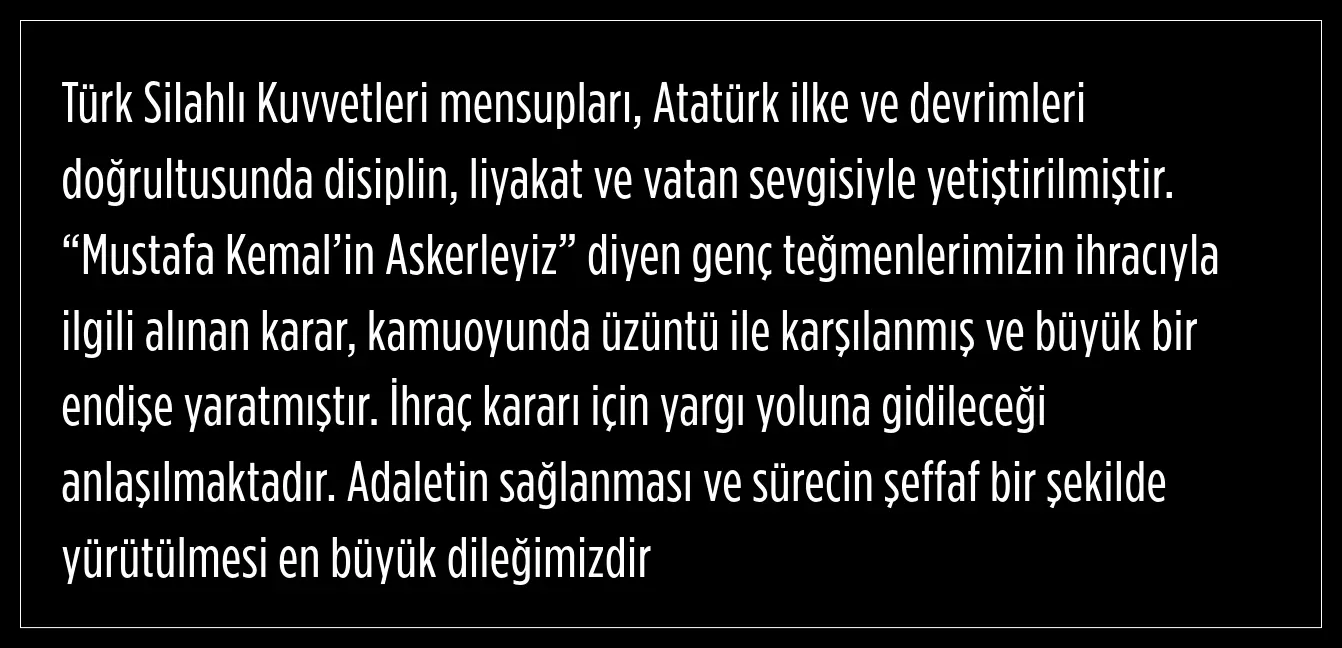 Veli Gündüz Şahin, genç teğmenlerin ihracıyla ilgili alınan kararın kamuoyunda üzüntü ile karşılandığını ve büyük bir endişe yarattığını ifade etti.
