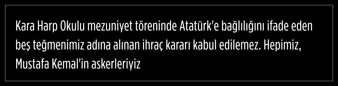 30 Ağustos 2024 tarihinde düzenlenen Kara Harp Okulu mezuniyet töreninde yeni mezun teğmenlerin "Mustafa Kemal’in askerleriyiz!" sloganı atması sonrası tahkikat ve soruşturma başlatıldı.