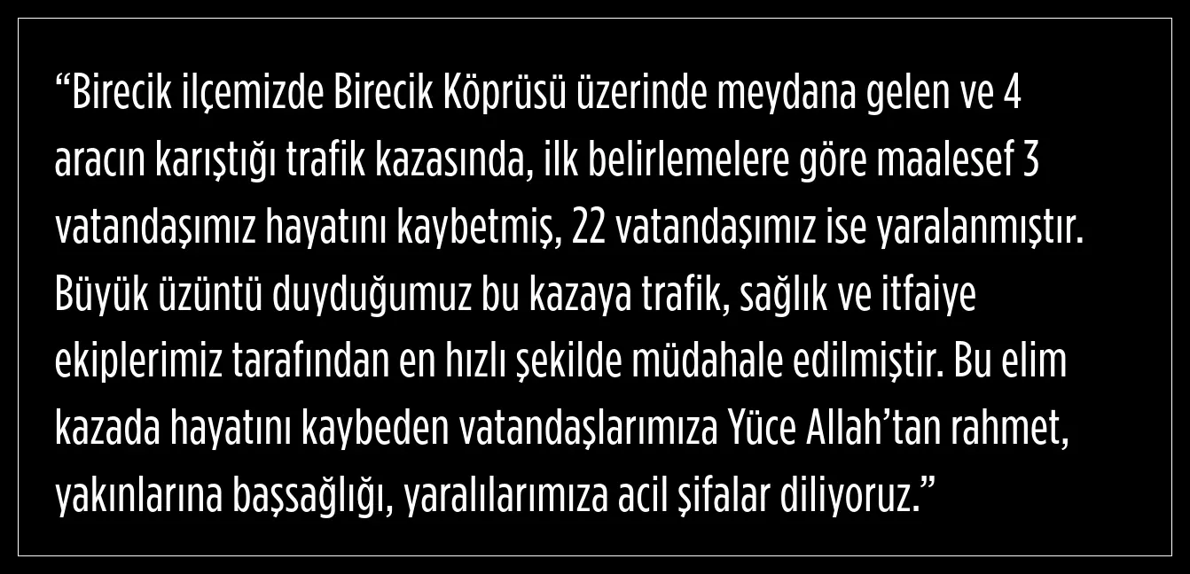 Şanlıurfa’nın Birecik ilçesinde, freni boşalan kamyon önündeki 7 araca çarptıktan sonra bir otomobille birlikte köprüden yaklaşık 10 metre yükseklikten alt yola düştü. Feci kazada 3 kişi hayatını kaybederken, 22 kişi yaralandı.
