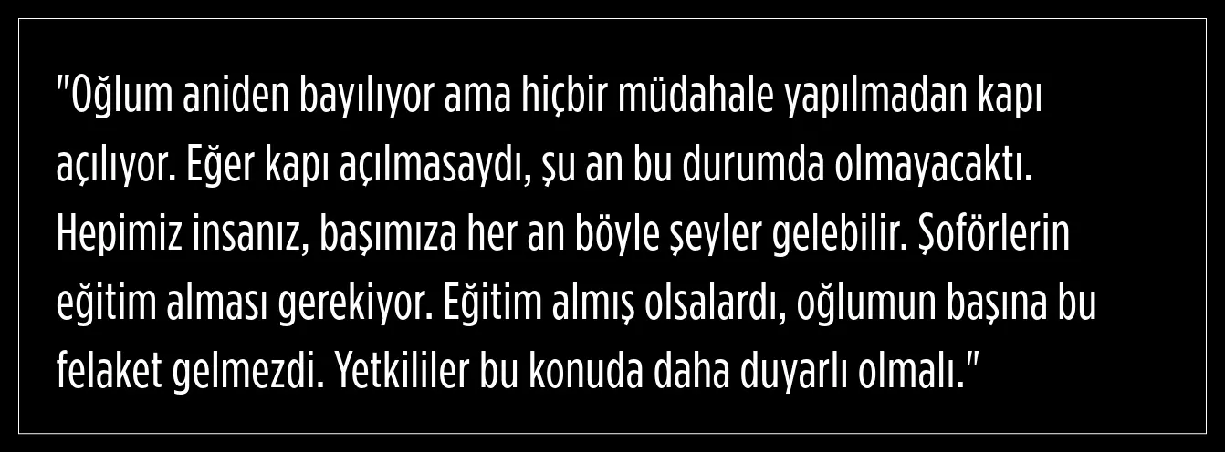 Oğlunun olay sonrası psikolojik olarak kötü etkilendiğini dile getiren baba Taşkın, “Evden çıkamıyor, geceleri korkarak uyanıyor, nöbet geçiriyor. Yanında sürekli nöbet tutuyoruz. Bu olayın sorumlusu sadece şoför değil, otobüs kooperatifleri ve ilgili kurumlar da denetim yapmadıkları için suçlular” dedi. Şikayet üzerine şoför hakkında hukuki süreç başlatıldı.