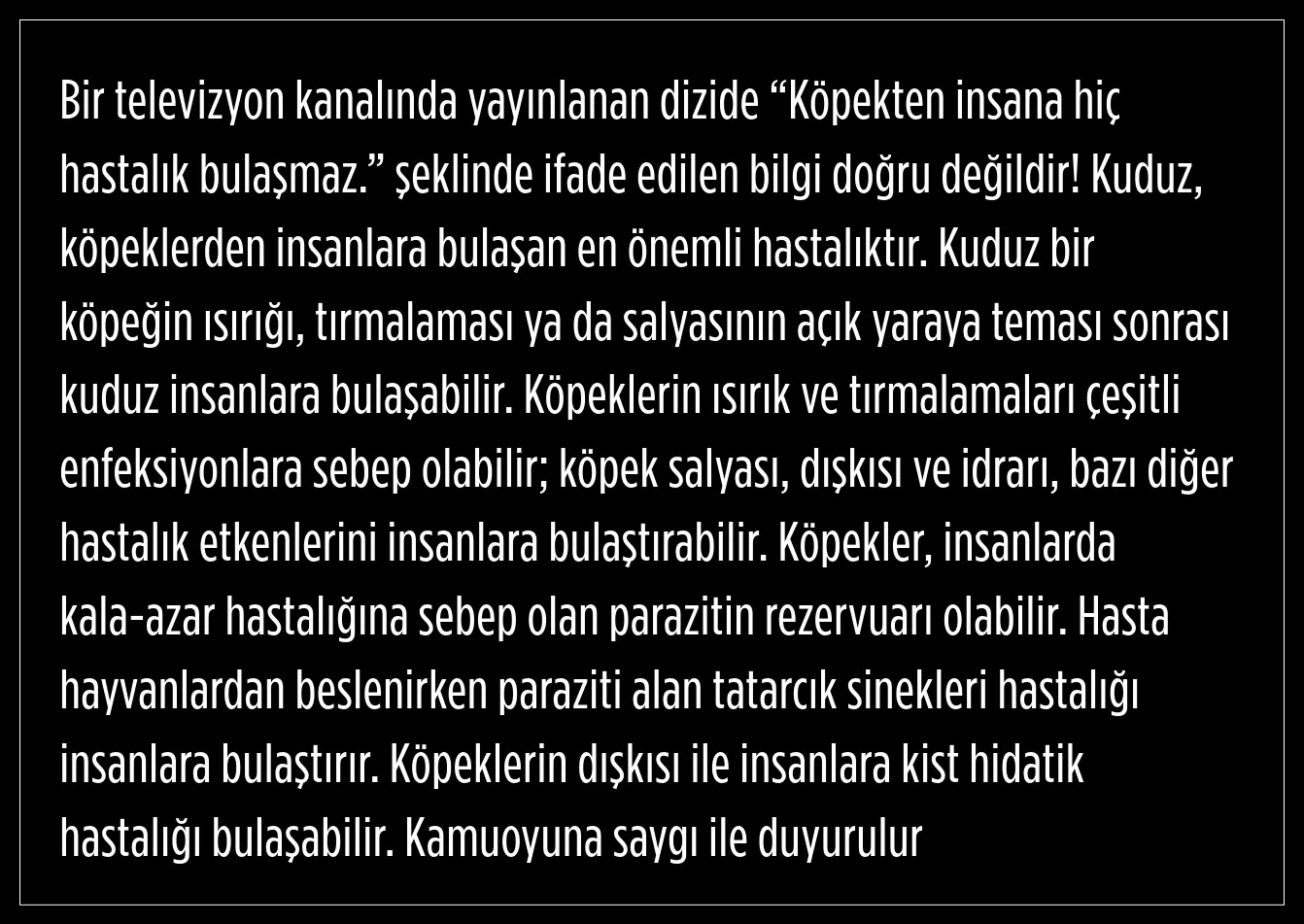 Dizide yer alan "Köpekten insana hiç hastalık bulaşmaz" sözleri sonrasında Sağlık Bakanlığından açıklama geldi.