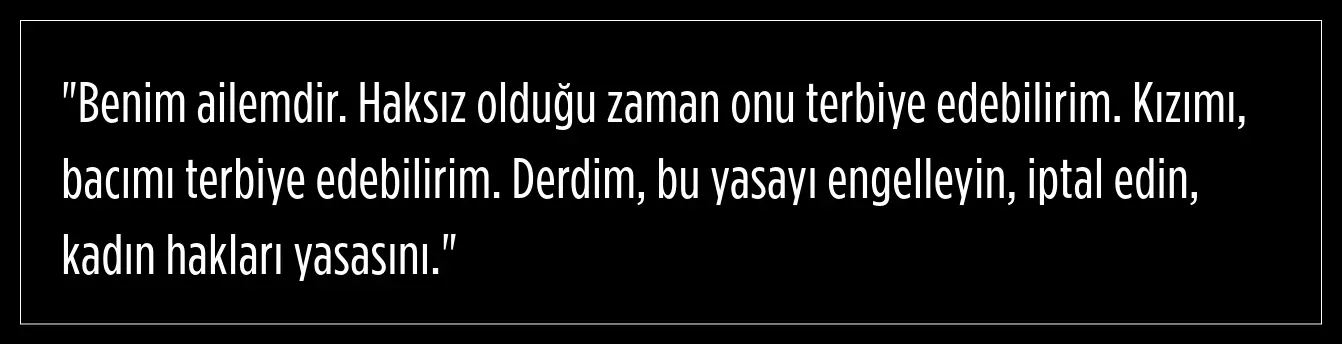 Bunun üzerine vatandaşın hala isteğini savunmayı sürdürdüğü görüldü. "Kadın hakları yasasının engellenmesi ve iptal edilmesi" yönündeki hayrete düşüren isteğini dile getiren vatandaş, şu ifadeleri kullandı: