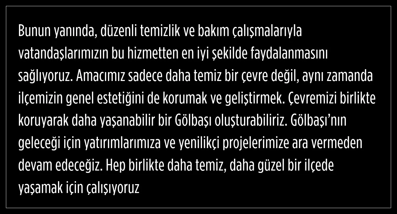 İlçede uzun yıllardır kullanılan ve artık hem estetik hem de işlevsellik açısından ihtiyaçlara cevap veremeyen eski çöp konteynerlerini yenilediklerini ifade eden Gölbaşı Belediye Başkanı Yakup Odabaşı, yerleştirilen yeni konteynerlerin dayanıklı yapısıyla hem uzun yıllar kullanılabileceğini hem de çevreye duyarlı tasarımıyla ilçeye yakışacağını söyledi.