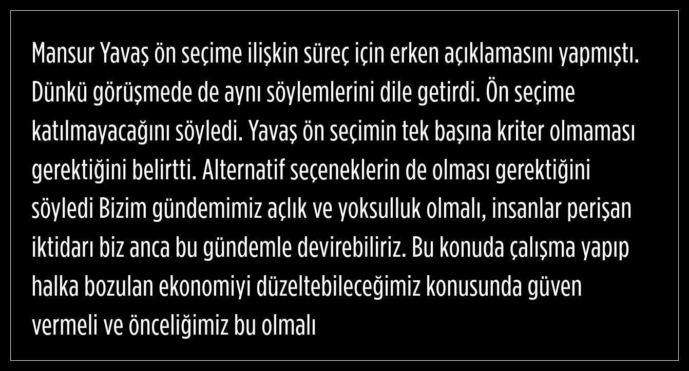 Mansur Yavaş'ın ön seçim sürecine ilişkin erken olduğu yönündeki açıklamasını dünkü görüşmede de dile getirdiği aktarıldı.