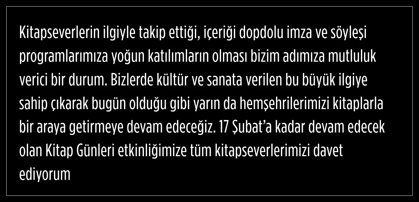 85 yazar ile imza günü ve 18 farklı konuşmacı ile söyleşi programlarının düzenlendiği, 85 yayınevinin stant kurduğu Pursaklar 3.Kitap Günleri alanına yoğun ilgi gösteren kitapseverlere sıcak çorba ikram ettiklerini ifade eden Pursaklar Belediye Başkanı Ertuğrul Çetin, şunları söyledi: