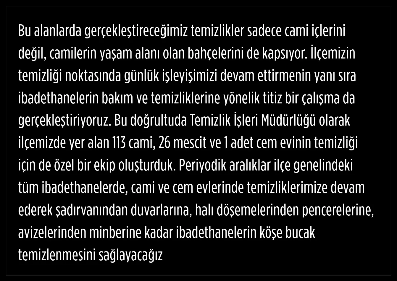 Belediye Temizlik İşleri Müdürlüğü ekipleri, ibadethanelerin iç temizliğini özenle gerçekleştirirken, bahçelerdeki çöpleri de toplayarak çevre düzenlemesi yapıyor. Cami duvarları, şadırvanlar, camlar ve halılar dahil olmak üzere tüm alanlar titizlikle temizleniyor.