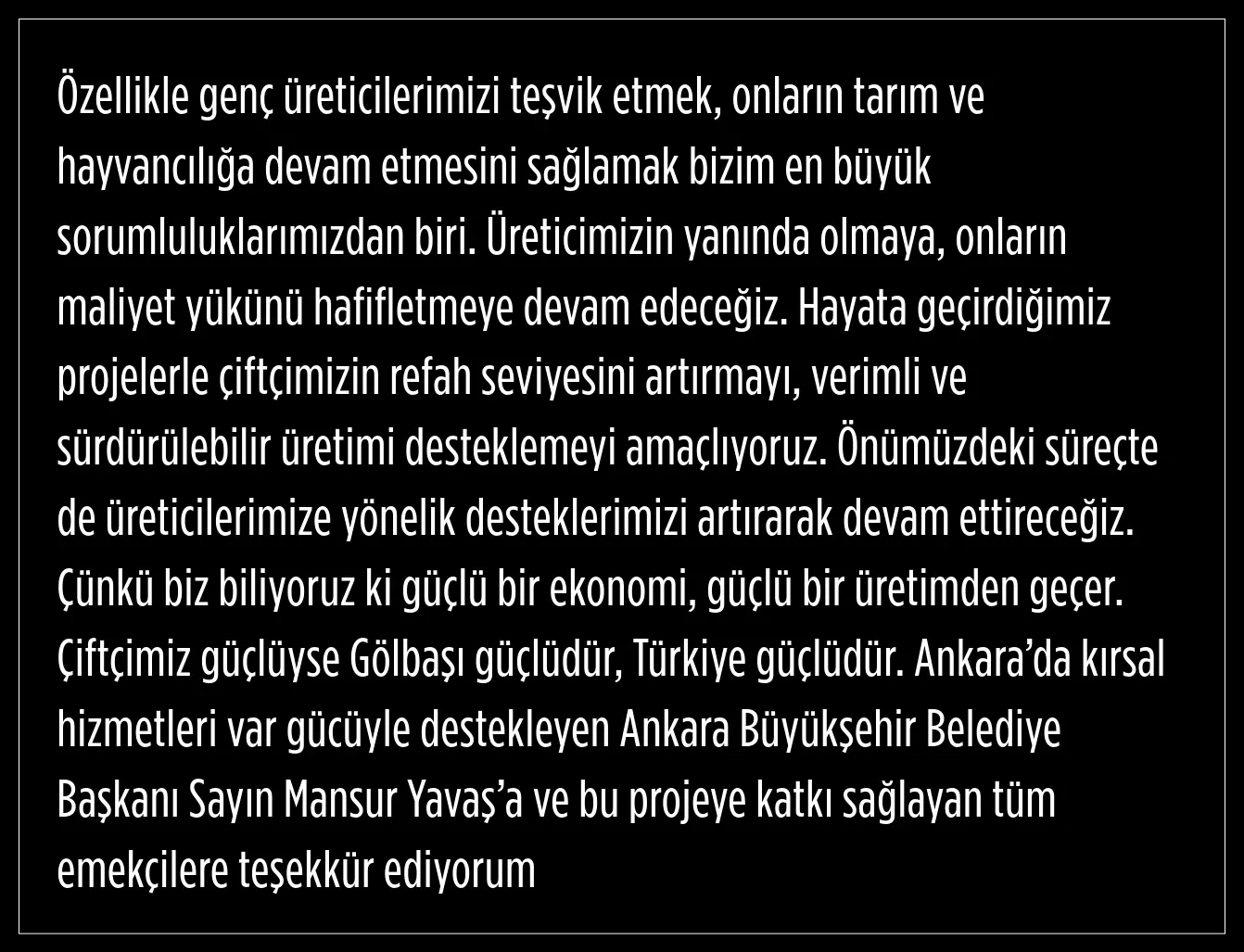 Çiftinin alın terinin, emeğinin ve üretiminin toplumun tamamı için büyük bir değer olduğunu ifade eden Gölbaşı Belediye Başkanı Yakup Odabaşı, yerel yönetimler olarak ücretinin yanında olmak ve desteklemek zorunda olduklarını söyledi.