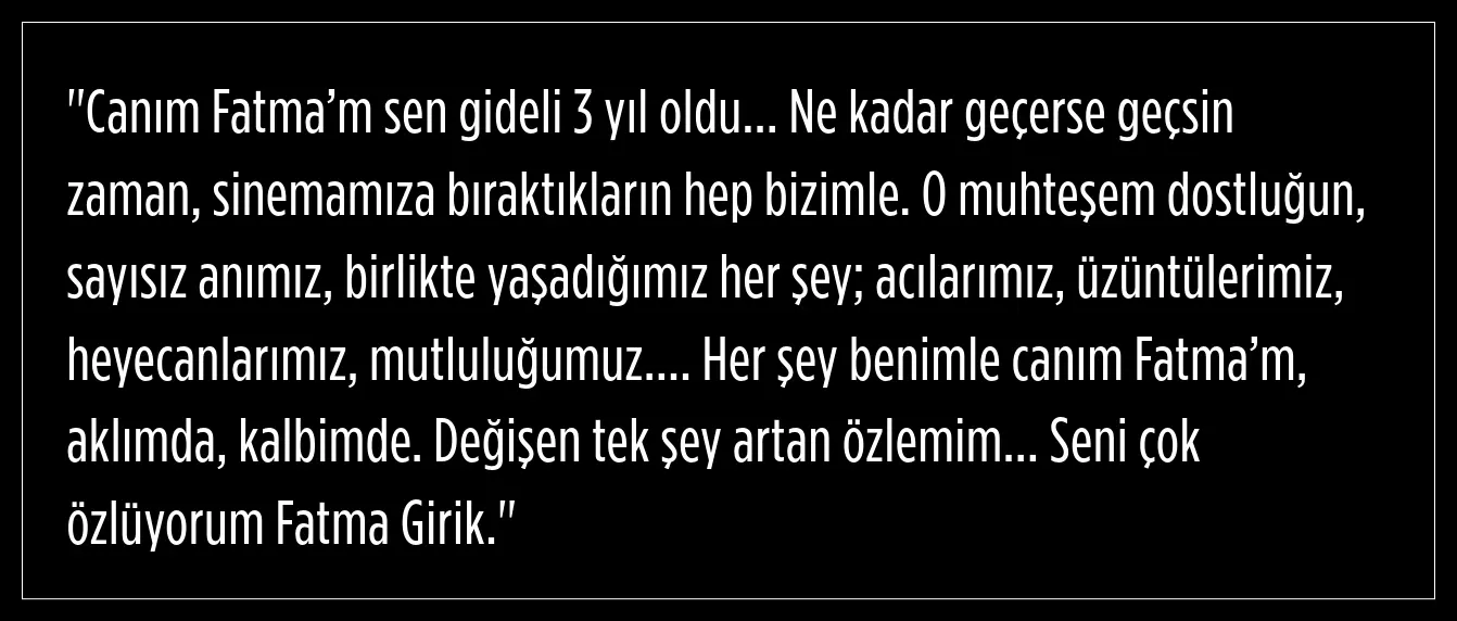 Yeşilçam’ın efsane isimlerinden Hülya Koçyiğit, yakın dostu ve Yeşilçam’ın bir başka efsane ismi Fatma Girik’in 3. ölüm yıl dönümünü unutmadı ve duygusal bir paylaşım yaptı.