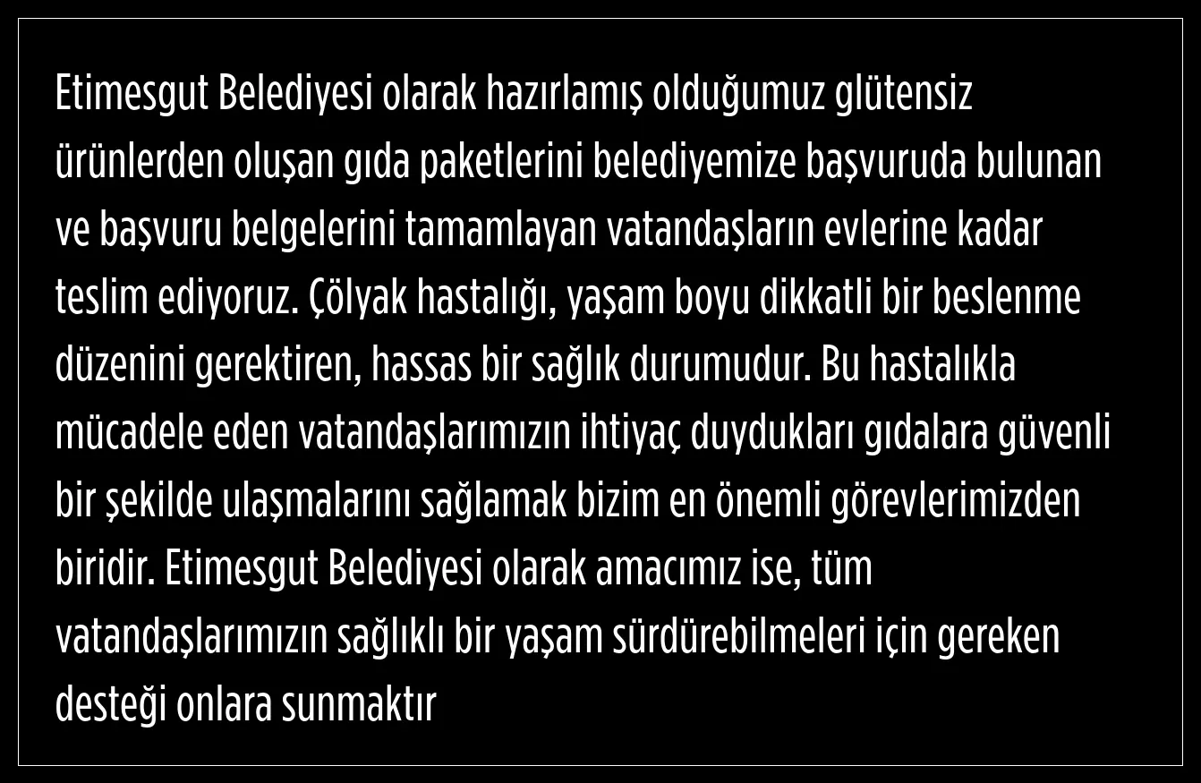 Etimesgut Belediyesi, çölyak hastalarına desteklerini sürdürüyor. Belediye, glütensiz ürünlerin yer aldığı kutular hazırlıyor ve onlara ulaştırıyor.
