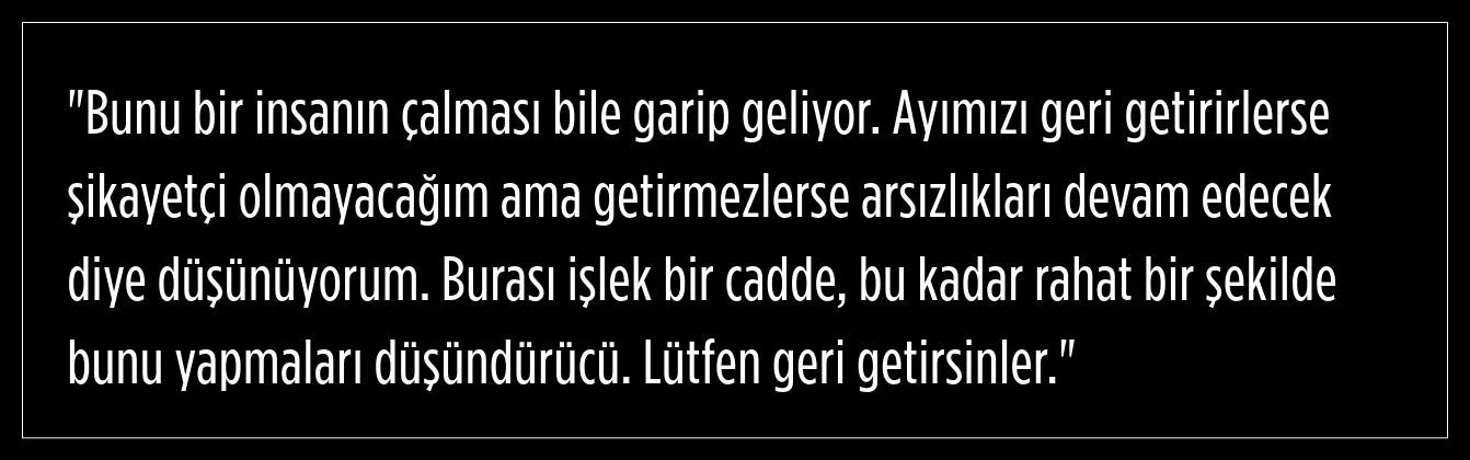 Yaşananlara anlam veremediğini belirten iş yeri sahibi Uğur Yürtsü, "Biz bu ayıyı buraya insanları gülümsetmek için koyduk. Çocuklar için asmıştık ama böyle bir hırsızlıkla karşılaştık. Sabah geldiğimde ayının olmadığını fark ettim. Sosyal medyada olayın görüntülerini bana attılar. Ayıyı alan kişi uyarılmasına rağmen 'Beğendim aldım' diyerek uzaklaşmış" dedi.