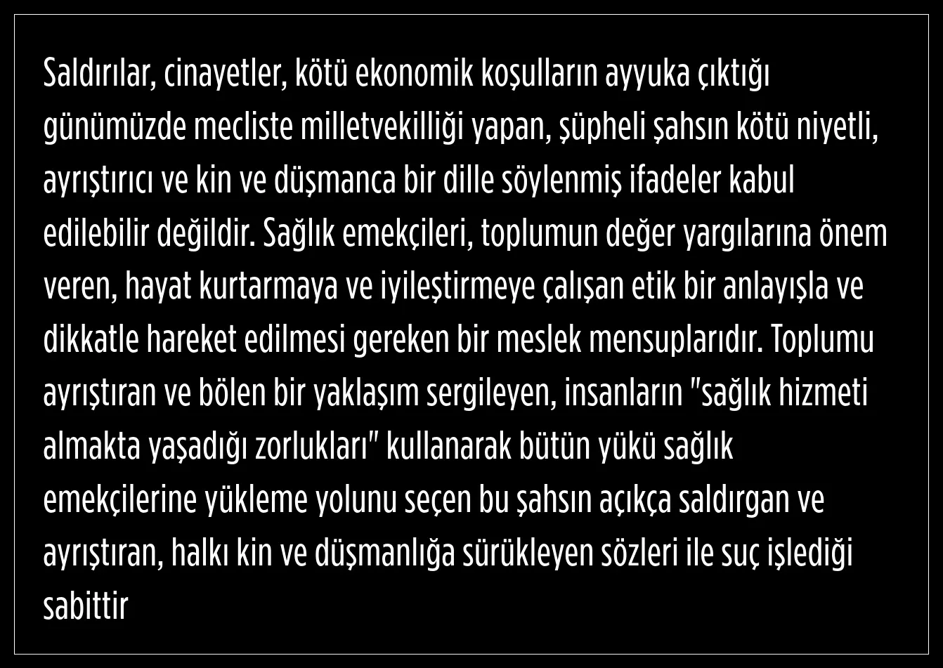 Bu sözler, özellikle sağlık çalışanlarına yönelik şiddet olaylarının arttığı bir dönemde kamuoyunda büyük yankı uyandırdı. Sağlık çalışanlarının güvenliğini tehdit eden, halkı kışkırtıcı ve ayrıştırıcı olarak değerlendirilen ifadeler, sağlık meslek grupları ve sendikalar tarafından sert bir şekilde eleştirildi.