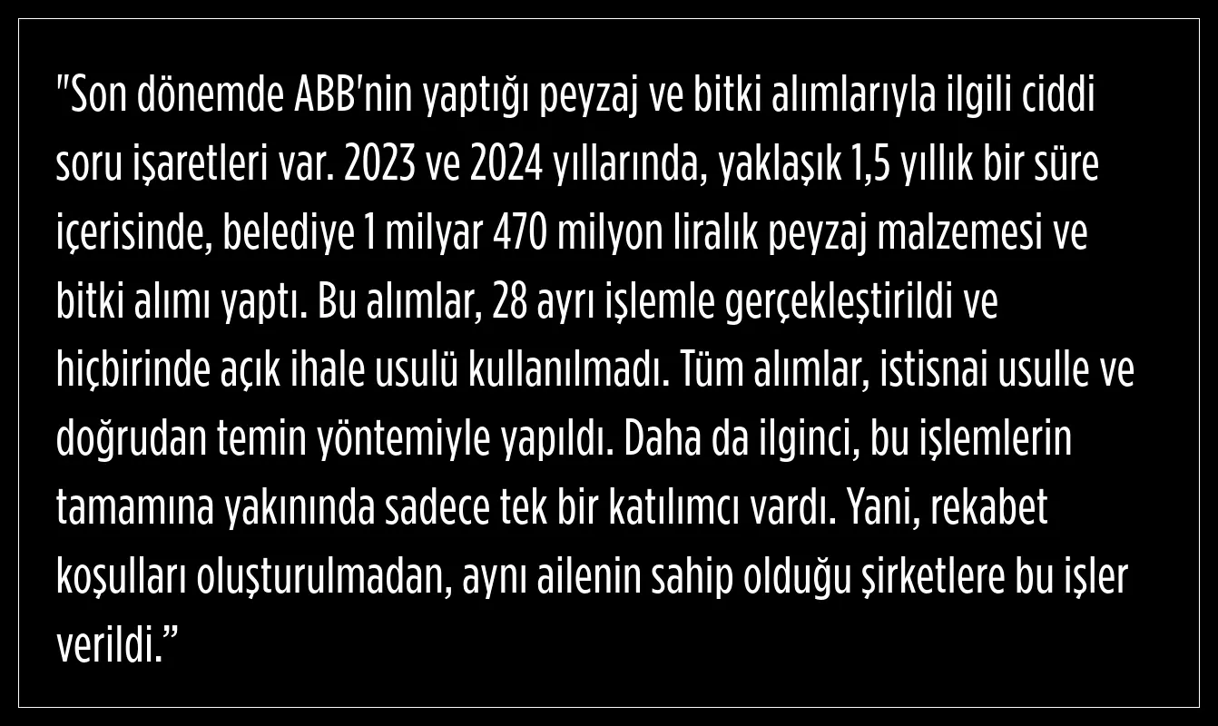 2023 ve 2024 yıllarında toplam 1 milyar 470 milyon liralık peyzaj ihalesi gerçekleştiren ABB’nin, bu alımları açık ihale yerine doğrudan temin yöntemiyle yaptığı iddia edildi. Nihat Yalçın, "Belediye 28 farklı ihale ile bitki ve peyzaj malzemesi alımı gerçekleştirdi ancak bu ihalelerde rekabet sağlanmadı ve tek bir firma kazandı.” dedi.