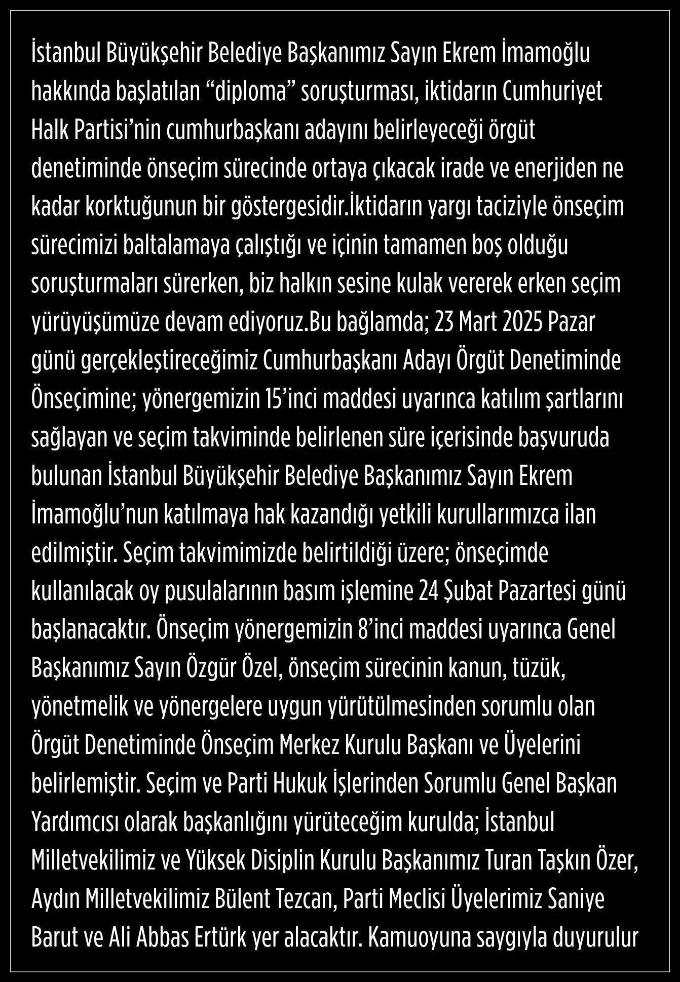 İstanbul Büyükşehir Belediye Başkanı Ekrem İmamoğlu, CHP (Cumhuriyet Halk Partisi) içinde yapılacak olan ön seçimde cumhurbaşkanı adayı olabilmek için başvurusunu geçtiğimiz günlerde yaptı. İmamoğlu, 116 milletvekilinin desteğini alarak ön seçime tek aday olarak katılmaya hak kazandı.
