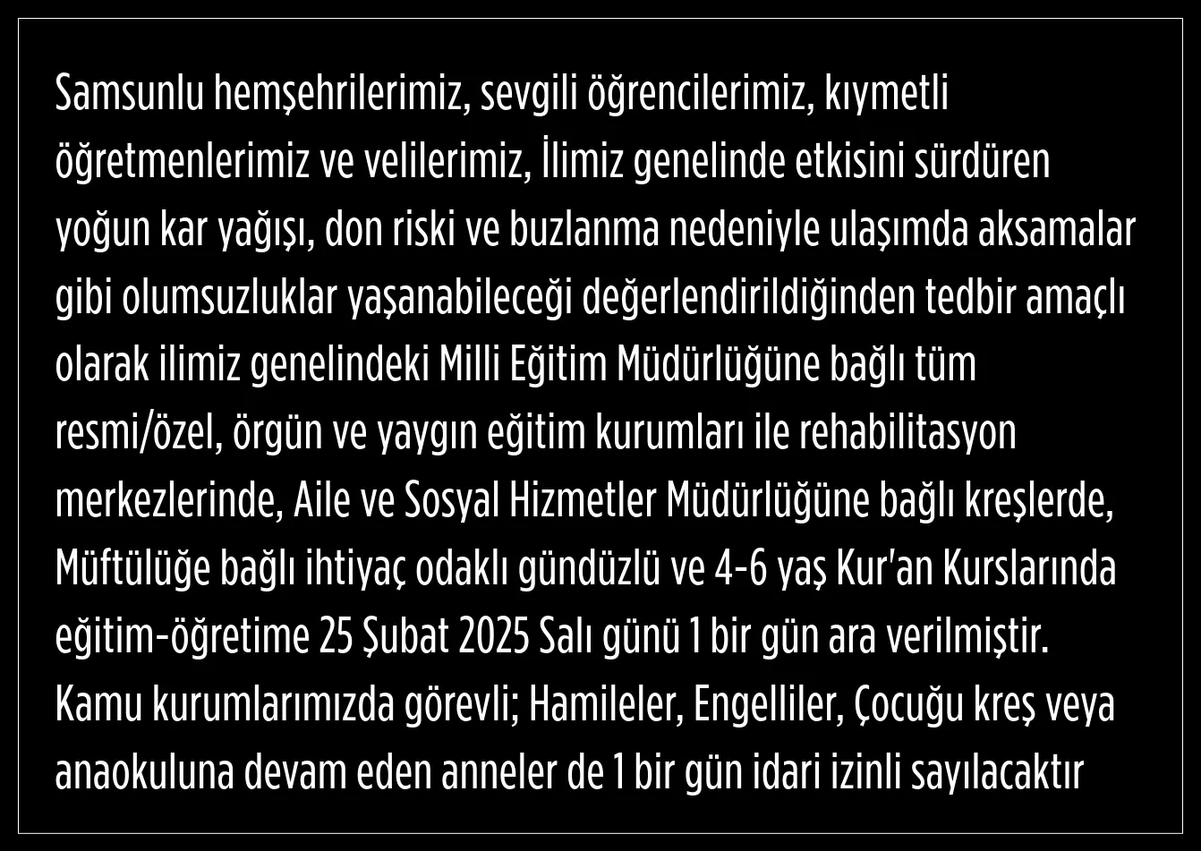 Samsun Valisi Orhan Tavlı, sosyal medya hesabı üzerinden yaptığı yazılı paylaşımla; don riski, yoğun kar yağışı ve buzlanma nedeniyle eğitime bir gün ara verildiğini belirtti.