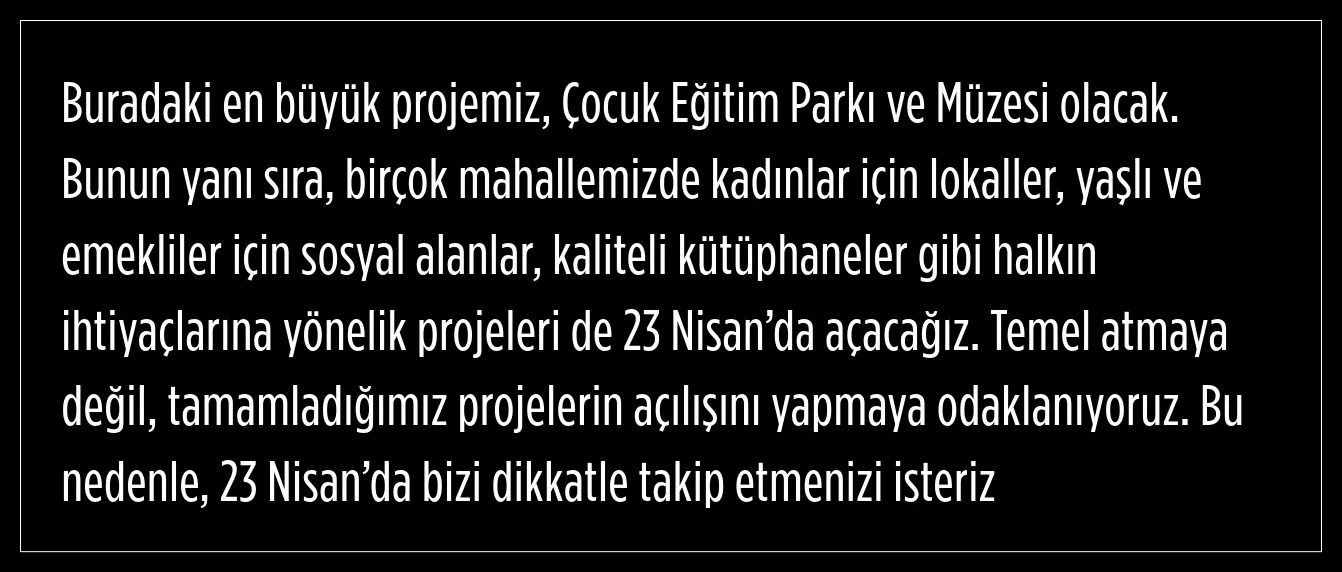 Keçiören Belediye Başkanı Mesut Özarslan, 23 Nisan'da, hayata geçirdikleri en büyük projelerden birisi olan "Çocuk Eğitim Parkı ve Müzesi'nin" açılışını yapacaklarını duyurdu. Açılışa CHP Genel Başkanı Özgür Özel ve ABB Başkanı Yavaş’ın da katılım sağlayacağını belirten Mesut Özarslan, şu ifadeleri kullandı: