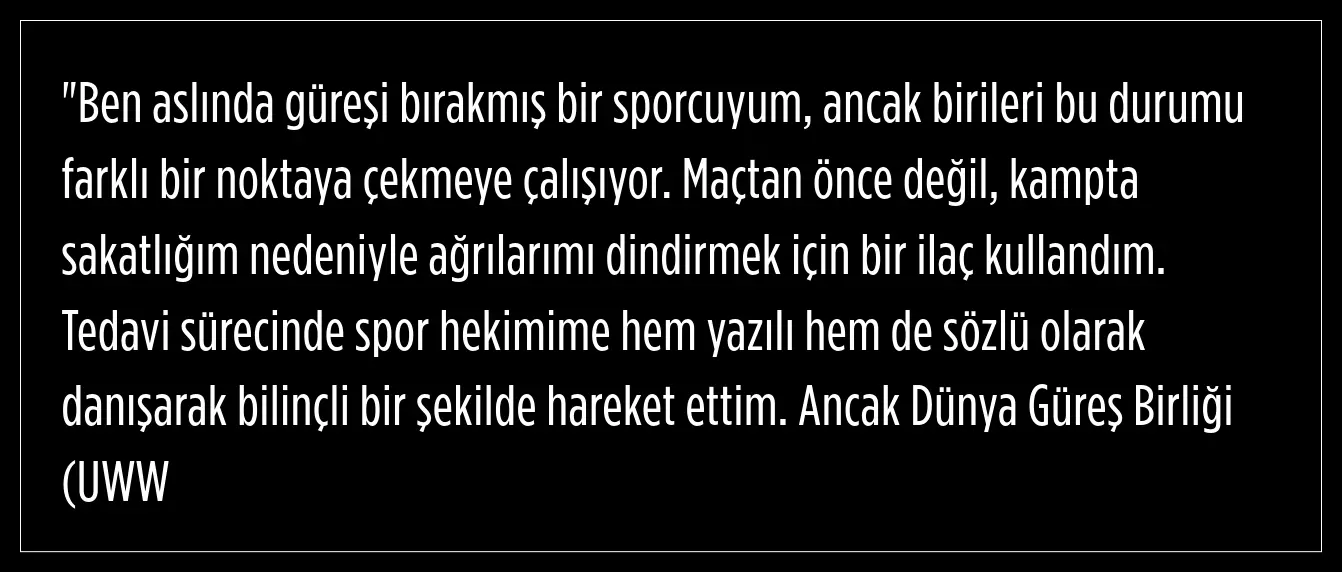 yetkilileri, bu süreçte spor müsabakalarına katılmamı geçici olarak askıya aldı. Temiz bir spor kariyerim var ve hiçbir madalyamda haksız bir başarı bulunmuyor. Ancak kariyerimin sonunda neden benimle uğraşıyorlar, anlamış değilim.")