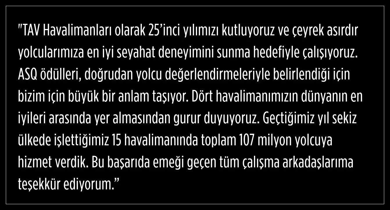 TAV Havalimanları Havalimanı İşletmelerinden Sorumlu Grup Başkanı Kürşad Koçak, ödüllerle ilgili yaptığı açıklamada şunları söyledi: